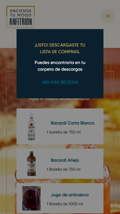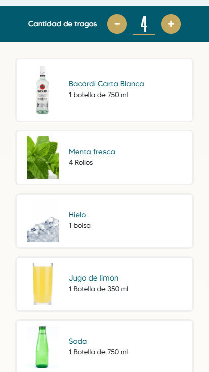 We helped Bacardi build a website that guides users on exactly what to purchase to prepare a specific number of cocktails. Users select their mood or preferred spirit and receive a curated list of cocktails. After choosing one, they enter the desired quantity and receive a downloadable shopping list.